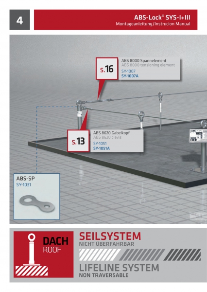 Für einen flächendeckenden Schutz gegen Absturz sind unsere Seilsicherungssysteme ABS-Lock SYS I (8mm, nicht überfahrbar) und III die ideale Lösung. Die aus Edelstahl gefertigten Anschlageinrichtungen basieren auf einem Stahlseil, das in nahezu beliebiger Länge entlang der zu sichernden Absturzkanten oder an nicht durchbruchsicheren Bauteilen gespannt wird, zum Beispiel auf dem Flachdach. Zu den typischen Einsatzorten für ein Seilsicherungssystem zählen Dachflächen, Industriehallen und Kranbahnen. Dabei haben Sie die Wahl zwischen dem ABS-Lock SYS I mit einem 8 mm starken Edelstahlseil und dem leichteren ABS-Lock SYS III mit 6 mm starkem Edelstahlseil. Beide Seile sind, wie fast alle Komponenten unserer Seilsicherungssysteme, aus besonders widerstandsfähigem V4A-Stahl gefertigt.