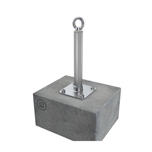 Der ABS-Lock X-SR-AS ist vollkommen aus witterungsbeständigem Edelstahl gefertigt und mit einem verschweißten Stützrohr verstärkt. So hält der Anschlagpunkt der wiederholten Belastung durch das Abseilen 1 Person problemlos stand. Die Montage am Untergrund erfolgt über eine Grundplatte, die mit 4 Einschlagdübel am Betonuntergrund verankert wird. Die Anker müssen dabei mindestens 70 mm tief in einer Betonschicht mit einer Mindeststärke von 120 mm befestigt werden.