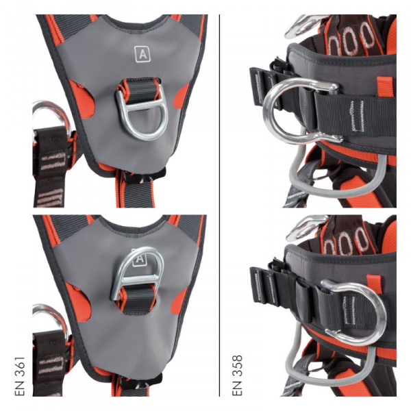 - seitliche Anschlagpunkte laut EN 358 mit zwei Positionen: bei Verwendung (im Work Modus)) sind sie am Gurt nach außen gerichtet, für die Verbindung mit einer Positionierungsschlinge; bei Nichtverwendung (im Stand-by Modus)) können sie nach innen geklappt werden, um die Bewegungsfreiheit des Nutzers nicht einzuschränken;