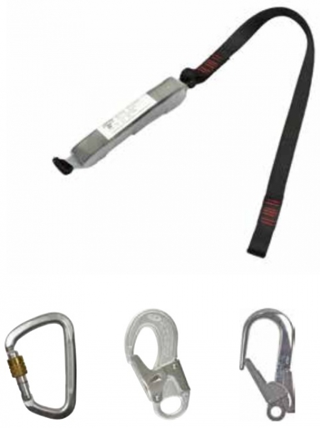 Verbindungsmittel Band K, Bandfalldämpfer-Seite mit Stahlschraubkarabiner (Abb. 1). Karabiner Band-Seite siehe Auflistung (Abb. 2 und 3, werden werkseitig eingenäht). Produkt ist kantengeprüft entsprechend „proposal of enquiry“ der VG11, CNB/P/11.074.