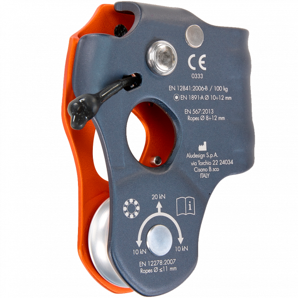 Multifunktionssteigklemme mit Umlenkrolle für alpines Bergsteigen, Rettung und Seilzugang. Robust, funktional und intuitiv, kann es auf vier verschiedene Arten verwendet werden: als Aufstiegsgerät, Seilrolle, Seilklemme / Seilrolle oder Rückholrolle.