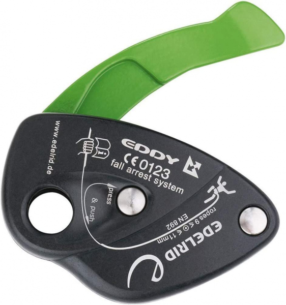 Das Eddy hat sich als Sicherungsgerät für das Sport- und Hallenklettern etabliert. Es ist für Einfachseile mit einem Durchmesser von 9,0 bis 11,0 mm geeignet. Die logische Seilführung und die automatische Double-Stop Blockierfunktion bei unkontrollierter Betätigung helfen Unfälle zu vermeiden und machen das Gerät vor allem für Anfänger interessant. Einer der großen Vorteile des Eddy ist die ÜberrissSicherung. Gerät der Sicherer in Panik und zieht den Ablasshebel des Eddy ganz nach hinten durch, so blockiert das Gerät komplett. Das Handling beim Ablassen ist angenehm und die Bremse lässt sich gut steuern. Die zügige Seilausgabe im Vorstieg stellt mit dem Edelrid Eddy kein Problem dar. Sowohl im Toprope als auch im Vorstieg ist dieses Sicherungsgerät optimal.