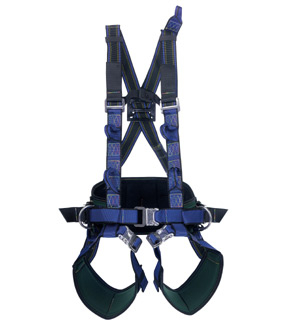 4-Punkt-Auffanggurt mit elastischen Schultergurtbändern, Haltegurt und Beingurtbändern.