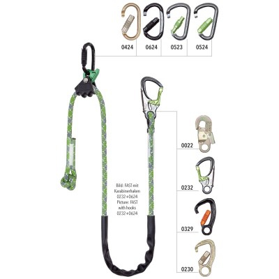 Verbindungsmittel nach EN 358 hergestellt aus Ø14 mm Kernmantelseil mit vernähten Endverbindungen, Alu-Seilkürzer zur Längeneinstellung, Karabinerhaken, Schutzschlauch und Schutzkauschen. Länge 1,5 m und 2,0 m. Andere Längen bitte anfragen.