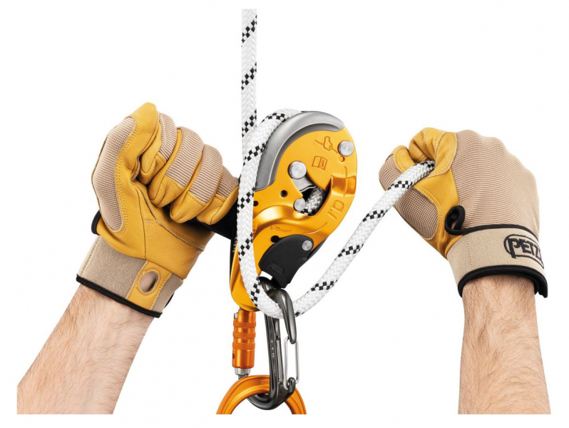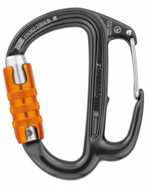 - Wenn der Karabiner umgedreht wird, schützt er die selbstbremsenden Abseilgeräte beim Umhängen von der Materialschlaufe in die ventrale Öse oder den Anschlagpunkt vor Herabfallen.