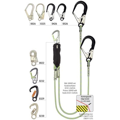 „Y“ Verbindungsmittel mit Falldämpfer, gemäß EN 354 und EN 355. Hergestellt aus Ø12 mm Kernmantelseil, vernähten Endverbindungen und Schutzkauschen. Bandfalldämpfer mit zuverlässigem und sehr schonendem Aufreißverhalten. Karabinerhaken auch nach Ihrer Wahl. Länge 1,5 m und 2,0 m.
