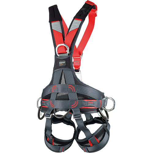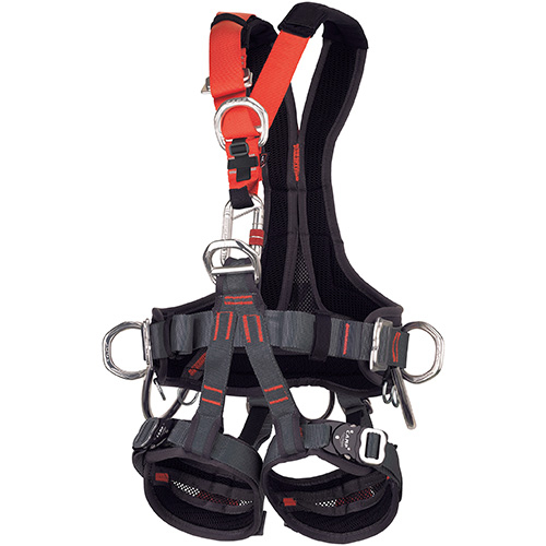 Komplettgurt für den Seilzugang, mit einem innovativen ergonomischen Rückenteil ausgestattet, der den Rücken und die Schultern des Trägers umhüllt. Rückenteil und Beinschlaufen belüftet.