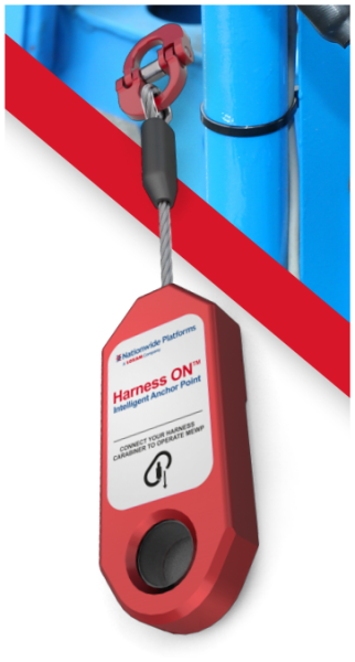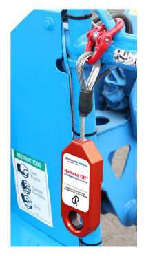 Harness ON™ ist ein intelligenter Anschlagpunkt, der den Betrieb der Hubarbeitsbühne stoppt, bis der Bediener seinen Gurtkarabiner anbringt. Harness ON™ ist fest mit dem Anschlagpunkt der Hubarbeitsbühne verbunden und elektronisch mit deren Funktionssteuerung verkabelt.