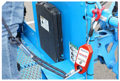 Sobald der Karabiner am Gurtzeug befestigt ist, signalisiert ein elektronisches Signal der Hubarbeitsbühne, dass der Betrieb nun sicher ist und ermöglicht die Funktion, bis der Karabiner endgültig gelöst wird.