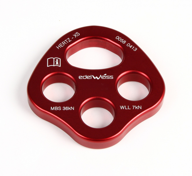Riggingplatte zur Standplatzorganisation und für Seilbahnen, bei Höhenarbeiten oder ähnlichen Einsätzen, die eine Verbindung vieler Sicherungspunkte erfordern. Ein grosser Verbindungspunkt und drei 15mm Pünkte, ideal für kleinere Arbeitsplätze.