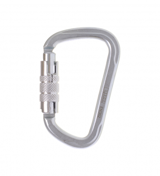 Auch der Verschluss des verzinkten Stahlkarabiners steht für maximale Sicherheit und ist mit seinem griffigen Trilock System nur durch eine Kombination aus Drehen, Schieben und Klappen zu öffnen.