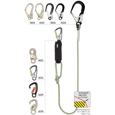 Verbindungsmittel mit Falldämpfer, gemäß EN 354 und EN 355. Hergestellt aus Ø12 mm Kernmantelseil, vernähten Endverbindungen und Schutzkauschen. Bandfalldämpfer mit zuverlässigem und sehr schonendem Aufreißverhalten. Karabinerhaken nach Ihrer Wahl. Länge 1,5 m und 2,0 m. Längenverstellbar durch Reibschnalle. Kantengeprüft.