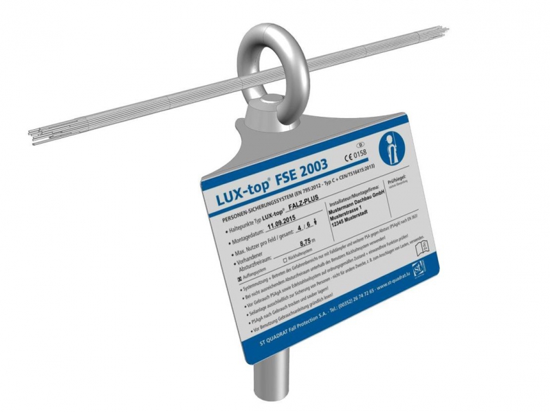 Bei dem System LUX-top® FSE 2003 handelt es sich um eine Anschlageinrichtung mit einer flexiblen Führung gemäß DIN EN 795:2012 Typ C + CEN/TS16415:2013, welche zum Anschlagen der persönlichen Schutzausrüstung gegen Absturz bei Arbeiten in absturzgefährdeten Bereichen dient. Der Zweck der Anschlageinrichtung besteht darin das Abstürzen von Personen zu verhindern, bzw. im Falle eines Absturzes eines Benutzers, diesen aufzufangen und ihn vor schweren oder gar tödlichen Verletzungen zu schützen. Das flexible System kann in Kombination mit den o.g. LUX-top® - Haltepunkten auf allen ausreichend tragfähigen Bauteilen montiert werden. Nach vorheriger Abstimmung mit dem Hersteller kann die Montage des Systems ebenfalls direkt an ausreichend tragfähigen Stahlkonstruktionen und Betonbauteilen erfolgen.