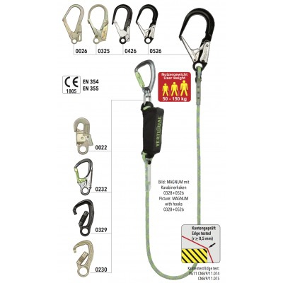 Verbindungsmittel mit Bandfalldämpfer gemäß EN 354 und EN 355. Aufgrund der speziellen Eigenschaften des Bandfalldämpfers, eignet sich der MAGNUM für Anwender mit einem Gewicht zwischen 50 und 150 kg. Der Fallstoß wird zuverlässig und sehr schonend auf einen Wert weit unter den zugelassenen 6 kN gedämpft. Das hochqualitative 12 mm PA Kernmantelseil ist besonders reissfest und zusätzlich nach VG11 CNB/P/11.074 CNB/P/11.075 kantengeprüft. Die vernähten Seilenden sind mit mobilen, transparenten Schutzhülsen versehen. Die Karabinerhaken werden individuell nach Kundenwunsch/ Kundenspezifikation montiert. Verfügbar in den Längen 1,5 m und 2,0 m. Andere Längen auf Anfrage.