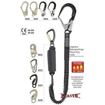 Verbindungsmittel mit Bandfalldämpfer gemäß EN 354 und EN 355. Aufgrund der speziellen Eigenschaften des Bandfalldämpfers, eignet sich der MAGNUM FLEX für Anwender mit einem Gewicht zwischen 50 und 150 kg. Der Fallstoß wird zuverlässig und sehr schonend auf einen Wert weit unter den zugelassenen 6 kN gedämpft. Das Verbindungsmittel ist aus einem 35 mm breiten, elastischem Schlauchband hergestellt. Für den Rettungsfall ist der MAGNUM FLEX mit einer Rettungsschlaufe versehen, die sich im Absturzfall selbstständig öffnet. Die Karabinerhaken werden individuell nach Kundenwunsch/ Kundenspezifikation montiert. Länge 1,9 m.