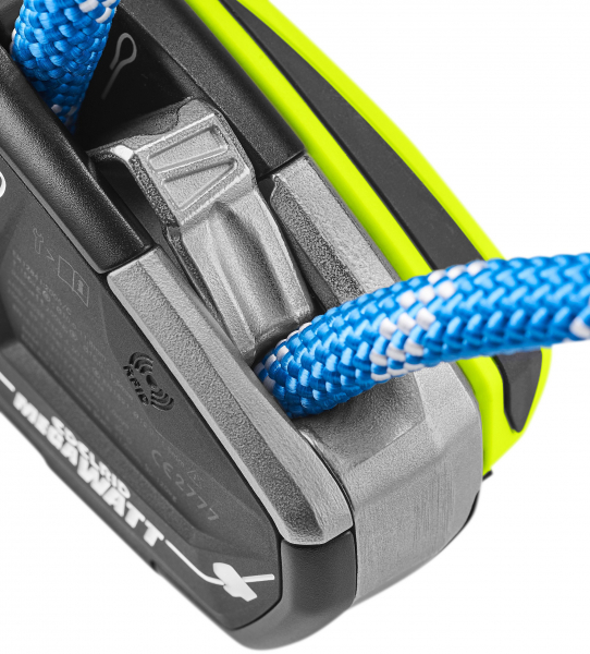 Der Vier-Wege-Sicherheitsverschluss ermöglicht ein bequemes Einlegen des Seiles, ohne das Gerät vom Karabiner zu trennen. An stark beanspruchten Stellen sorgen robuste Stahleinsätze für eine lange Lebensdauer.