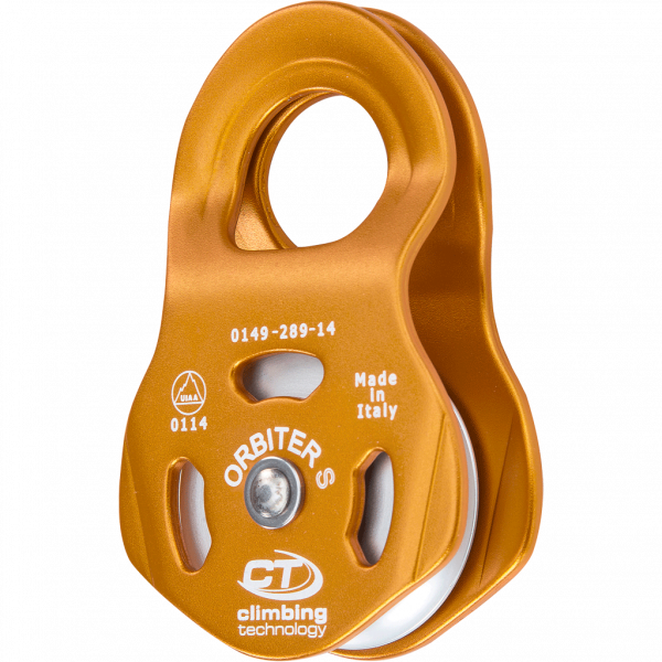 Seilrolle mit mobilen Flanschen, welche das Einfügen von jeglichem Karabiner ermöglichen.