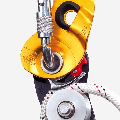 Die PRO TRAXION-Umlenkrolle mit Rücklaufsperre kann am Seil installiert werden, wenn sie am Anschlagpunkt befestigt ist. Dank ihrer großen Rolle und ihres sehr hohen Wirkungsgrads eignet sie sich besonders zum Nachziehen von schweren Lasten. Das bei Belastung verriegelte Seitenteil verhindert, dass sich die Umlenkrolle während der Benutzung öffnet. Die untere Verbindungsöse ermöglicht das Einrichten unterschiedlicher Flaschenzugsysteme.