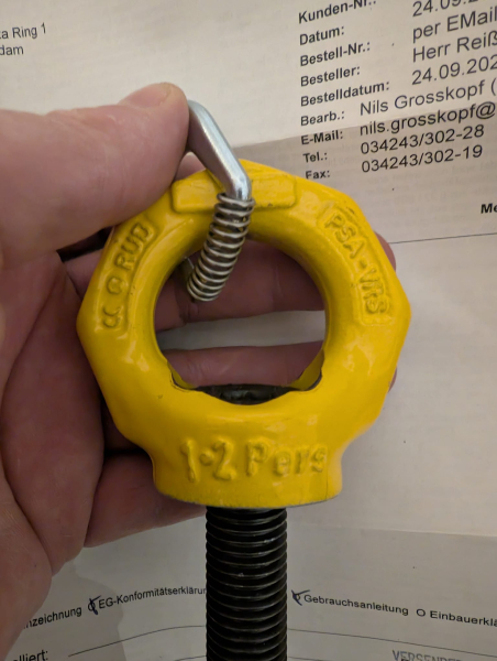 - Die Ösen entsprechen den EG-Richtlinien für persönliche Fallsicherung (89/686/EWG). Sie sind sowohl mit einem CE-Zeichen als auch mit der Personenanzahl markiert, die sich an einer Öse sichern darf.