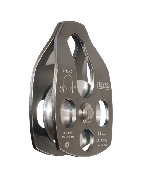 Die stabile Seilrolle aus Aluminium hat eine enorm hohe Bruchlast von 42 kN und kann für Seile mit einem Durchmesser von bis zu 15 mm verwendet werden.