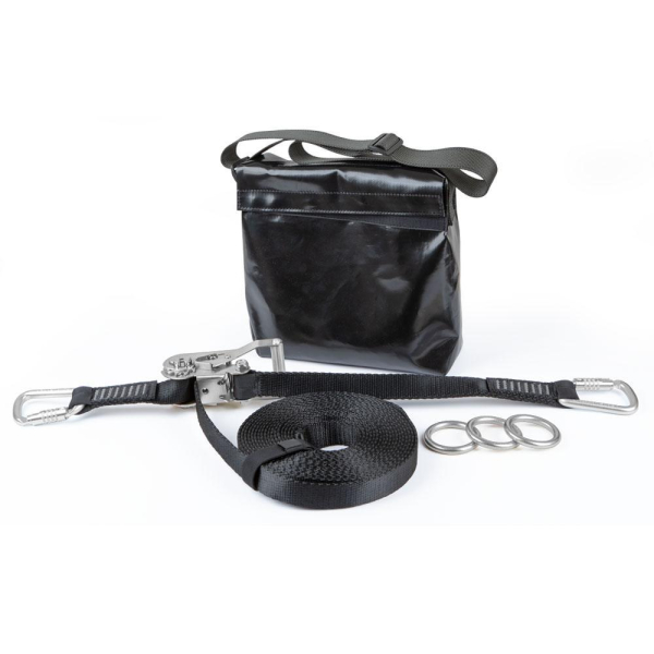 Temporäre Lifeline aus starkem PES Gurtband. Stabile Spannratsche. Inklusive Stahl Karabinerhaken für die Endschlaufen und Transport-/Aufbewahrungstasche.