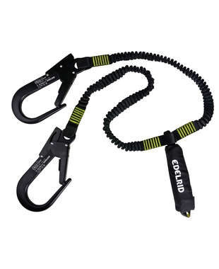 Neuartiges Verbindungsmittel mit integriertem Bandfalldämpfer und großen Alu-Anschlagkarabinern.