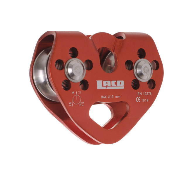 Mit ihrer Bruchlast von 28 kN und einer weiten Öffnung, in der bis zu drei Karabiner gleichzeitig eingehängt werden können, ist die LACD Doppelseilrolle für den Transport von Menschen und Materialien geeignet.