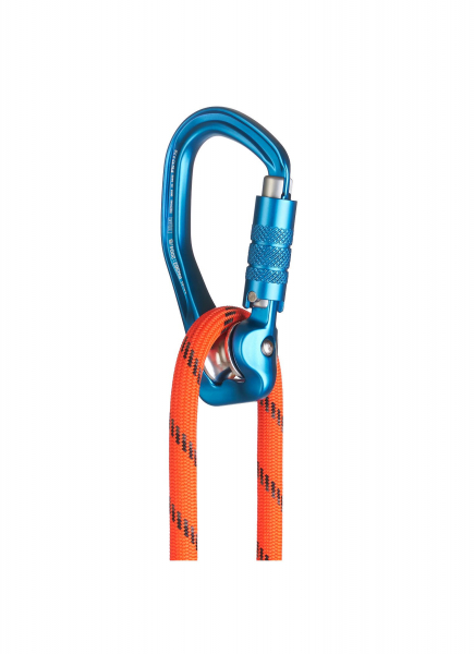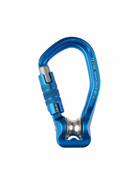 Sein Schnapper ist mit einem Trilock Verschluss mit Keylocksystem gesichert, der wirkungsvoll unbeabsichtigtes Öffnen verhindert. In Längsrichtung hält der Seilrollenkarabiner 20 kN stand.