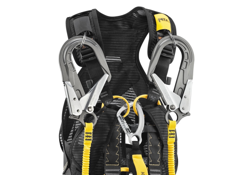 - Der Hüftgurt und der Bereich unterhalb der dorsalen Auffangöse sind mit einem Abriebschutz versehen, um die Abnutzung bei der Fortbewegung im Turm der Windkraftanlage zu reduzieren.