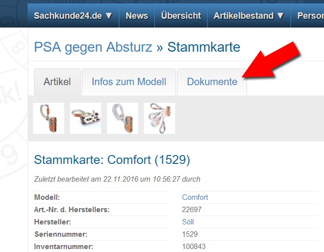 Die vollständig überarbeitete Dokumentenverwaltung gibt Ihnen besser als je zuvor die Möglichkeit, für die Verwaltung und Prüfung Ihres Artikelbestandes relevante Dokumente, wie z. B. Gebrauchsanleitungen und sonstige Herstellerinfos, aber auch Weblinks auf externe Informationsquellen hinzuzufügen. In der neuen Dokumentenverwaltung spielt es keine Rolle, ob es sich um ein Modell aus dem öffentlichen Modellverzeichnis handelt oder ob es ein selbst angelegtes und nur firmenintern gültiges Modell ist. Sie können zu jedem Modell eigene Dokumente hinzufügen. Ihre selbst hochgeladenen Dokumente werden dabei aber nicht öffentlich zugänglich gemacht. Sie bleiben nur für die mit Ihrem Firmenprofil verbundenen Personen sichtbar.Die neue Dokumentenverwaltung ist zudem in Rubriken eingeteilt. Ordnen Sie ein Dokument einmalig einem bestimmten Hersteller zu und Sie haben später bei allen Modellen dieses Herstellers Zugriff, die Sie im System angelegt haben. Auch eine Anleitung, die für alle Karabiner dieses Herstellers gilt, muss damit nur noch einmal hochgeladen werden, wenn die entsprechende Zuordnung bei Hersteller und Familie vorgenommen wird.