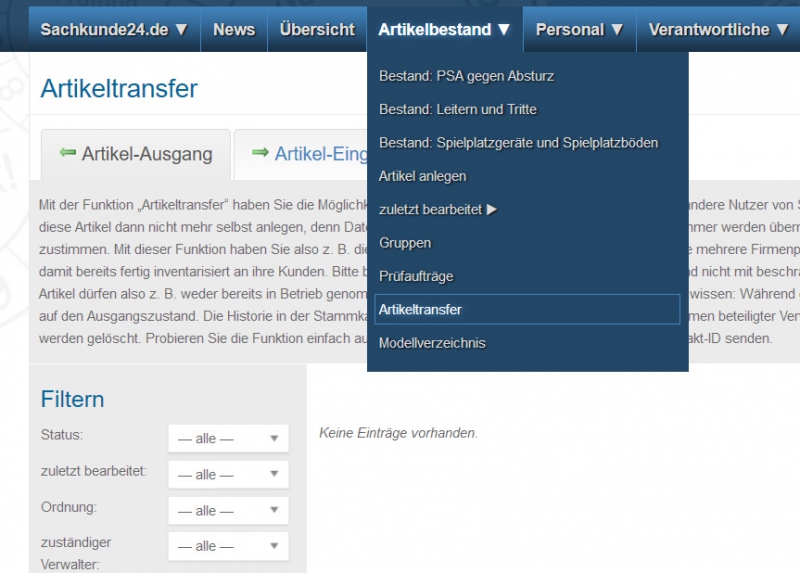 Mit einem „Artikeltransfer“ können bereits in Ihrem Firmenprofil angelegte Artikel an andere Nutzer von Sachkunde24.de übertragen werden. Der Empfänger muss diese Artikel dann nicht mehr selbst anlegen, denn Daten wie z. B. Modell, Herstellungsdatum und Seriennummer werden übernommen. Der Empfänger muss lediglich dem Transfer zustimmen. Mit dieser Funktion haben Sie also z. B. die Möglichkeit, Artikel hin- und herzuschieben, wenn Sie mehrere Firmenprofile betreuen und Händler übergeben verkaufte Artikel damit bereits fertig inventarisiert an ihre Kunden. Alle Kunden, die Ihre Ausrüstungen von uns beziehen, bekommen diese nun fertig inventarisiert über das System zugestellt. Andere Händler im System können dies mit ihren Kunden ebenso handhaben.Bitte beachten Sie, dass ein Artikeltransfer nur mit neuen und nicht mit beschränkt angelegten Artikeln möglich ist. Zu übertragende Artikel dürfen also z. B. weder bereits in Betrieb genommen, noch firmenintern angelegt worden sein. Gut zu wissen: Während des Artikeltransfers erfolgt ein Reset der Datensätze auf den Ausgangszustand. Die Historie in der Stammkarte aller Artikel wird um mögliche Einträge und die Namen beteiligter Verwalter bereinigt, selbst hinzugefügte Artikelfotos usw. werden gelöscht. Probieren Sie die Funktion einfach aus, indem Sie einen Artikeltransfer an Ihre eigene Kontakt-ID senden.