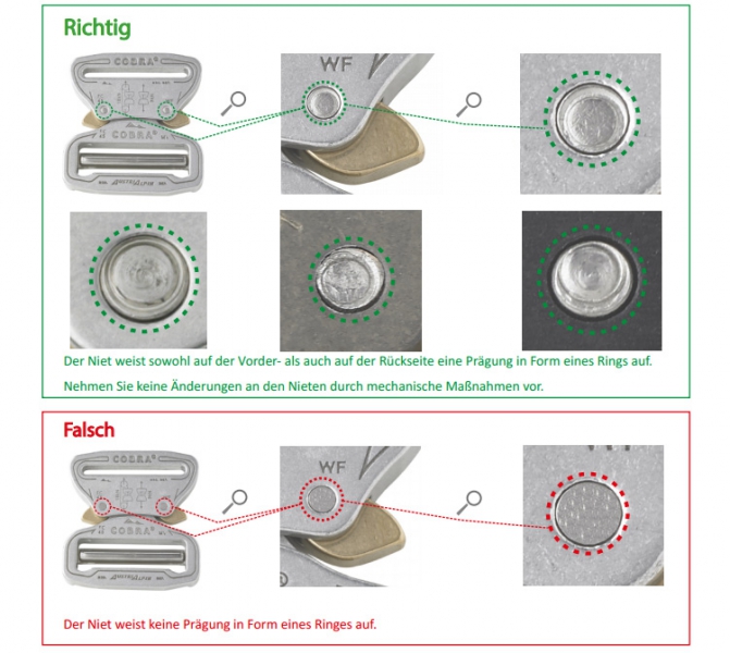 AustriAlpin bittet alle Kunden und Endbenutzer der COBRA® -Schnallen eine Sichtprüfung nach Herstellerangaben durchzuführen. Es ist zu kontrollieren, ob der Niet sowohl auf der Vorder- als auch auf der Rückseite eine Prägung in Form eines Rings aufweist.Wenn Sie bemerken, dass eine Schnalle NICHT genietet ist, oder wenn Sie irgendwelche Bedenken haben, STOPPEN Sie die NUTZUNG des Produkts umgehend und wenden Sie sich an Austrialpin: office@austrialpin.at oder per Telefon +43 522 56 52 48