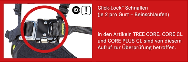 Die von dem Fehler betroffene Schnalle wurde ausschließlich in den Modellen TREE CORE, CORE CL und CORE PLUS CL verbaut. Bitte stellen Sie den Gebrauch dieser Gurtmodelle sofort ein und überprüfen Sie, ob die Schnalle an Ihrem Gurt durch das einseitige Drücken geöffnet werden kann (siehe bebilderte Anleitung).