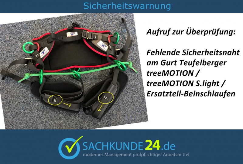 Da nach dem Versagen der Kontrollen nicht ausgeschlossen werden kann, dass dieser Fehler auch noch bei weiteren im Umlauf befindlichen Gurten vorhanden ist, fordert Teufelberger seine Kunden auf, bei den Gurten treeMOTION und treeMOTION S.light sowie den entsprechenden Ersatzteil-Beinschlaufen die Sicherheitsnähte zu kontrollieren.