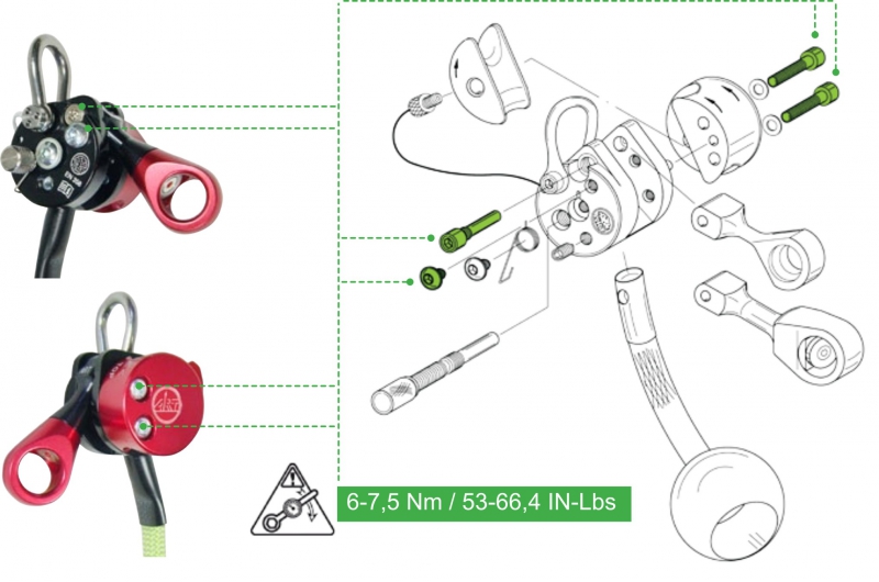 Die betroffenen Schrauben (s. Abb.) können vom Anwender selbst geprüft und nachgezogen werden. Diese Schrauben sichern die austauschbaren Teile „Karabiner-Aufnahme“ und „Klemmwange“ (Verschleißteil), die unter Einhaltung der in der Bedienungsanleitung empfohlenen Werte ausgetauscht und verschraubt werden dürfen.