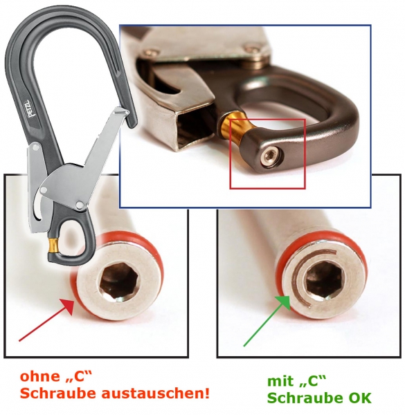 Alle Schrauben, die nicht mit einem "C" gekennzeichnet sind, müssen ausgetauscht werden. Für den Austausch der Schraube wenden Sie sich bitte an den Petzl-Distributor in Ihrem Land. Er wird Ihnen für alle in Ihrem Besitz befindlichen neuen MGO OPEN einen Umbausatz zusenden.