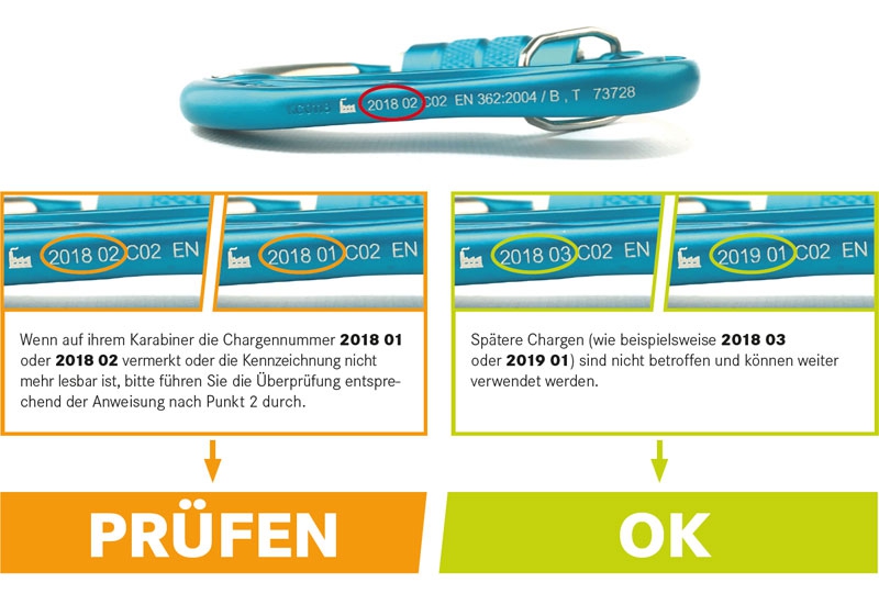 Bitte stellen Sie die Benutzung der genannten Karabiner ein und und führen Sie vor einer weiteren Verwendung das Prüfverfahren nach Herstellerangaben durch.