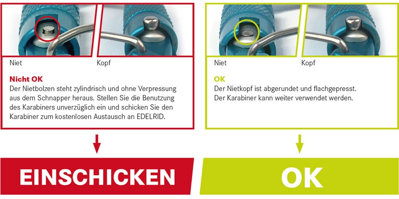 Im Interesse der Kundensicherheit hat sich EDELRID dazu entschlossen, einen Aufruf zur Sicherheitsüberprüfung durchzuführen. Die Besitzer von HMS Bulletproof Triple und HMS Bulletproof Triple FG werden aufgerufen zu überprüfen, ob die Nieten an ihren Karabinern vollständig vernietet sind.
