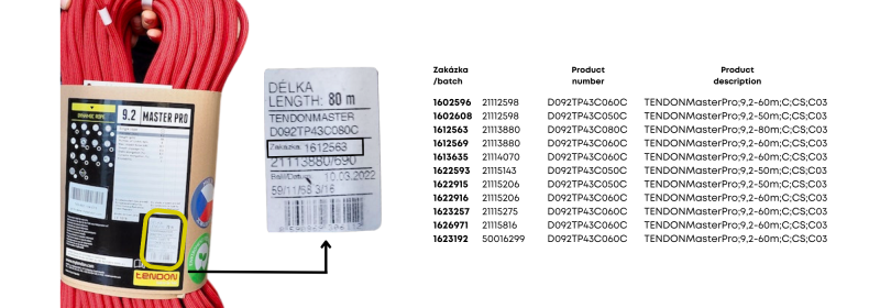 Der Hersteller der Marke Lanex informiert seine Kunden darüber, dass ein Teil der hergestellten Kletterseile TENDON Master Pro 9,2 mm, CS als Vorsichtsmaßnahme vom Markt zurückgerufen wird.