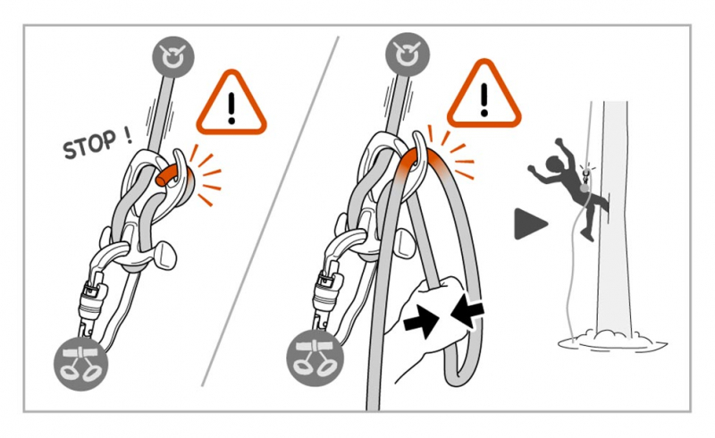 In machen Situationen, in denen der Anwender das Seil im PIRANA durchlaufen lässt, um sich absichtlich ins Wasser fallen zu lassen, läuft das Seil sehr schnell durch das Abseilgerät und kann dadurch unbeabsichtigt in der Blockierrille des PIRANA hängenbleiben und verhaken. Der Anwender ist also blockiert und kann das Seil in dieser Position nicht lösen. Diese Situation kann gefährlich sein und es besteht Ertrinkungsgefahr, inbesondere wenn der Anwender unter einem Wasserfall oder in einem Wasserbecken blockiert ist. Betroffenen Produkte: