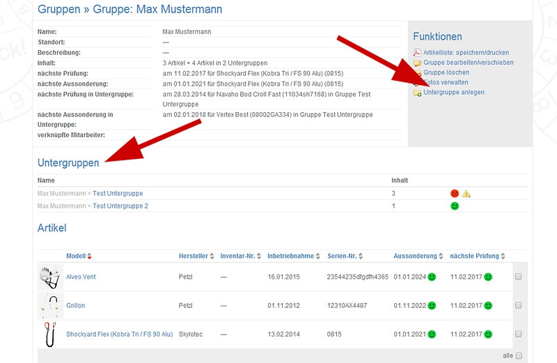 Bereits jetzt können Sie Ihre Artikel übersichtlich in Gruppen zusammenfassen. So können Sie z.B. PSA gegen Absturz mit dem Gruppennamen "Max Mustermann" dem jeweiligen Mitarbeiter zuordnen und auch Gruppennamen im Stil "PSA-Set 1", "Kiste Nr. 2", "Fahrzeug P-SAK 24" oder "Werkstatt Leipziger Straße" verwenden.